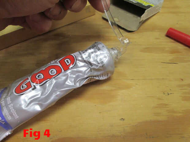 Tome una tira de botella de aderezo de chatarra o palito y poner en un poco de pegamento Goop del tamaño de un chip de chocolate. (Fig 4)