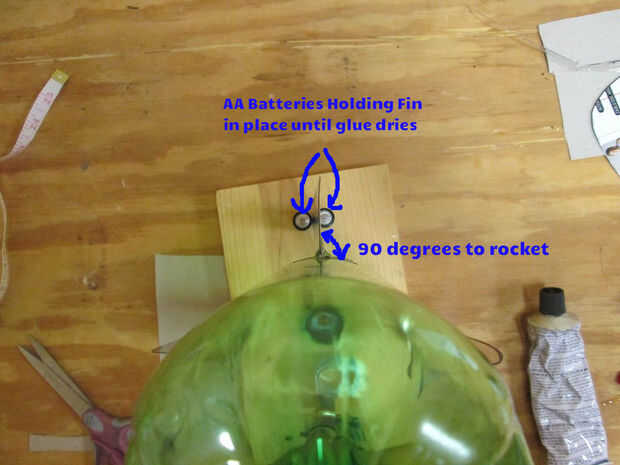 Ahora tenemos que alinear las aletas. Mire en la parte superior del cohete y asegúrese de que la aleta está en ángulo recto con respecto al cohete. Puede globo ocular esto. No tiene que ser perfecto, pero más estrecha y más recta lo consigues, mejor va a volar. Usé una batería AA en cada lado de la aleta para mantenerlo en su lugar hasta que el adhesivo se seque.