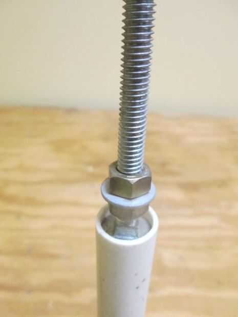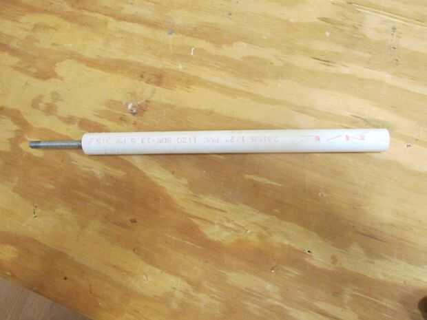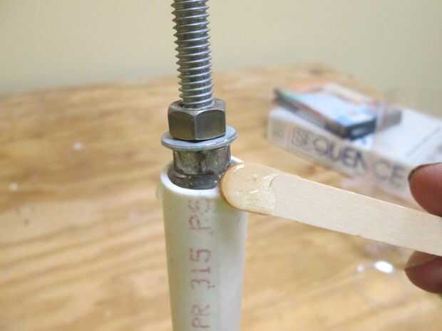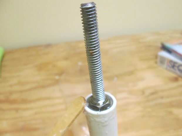 Hay una manera fácil de hacer un cono de nariz agradable, simétrico. Hacer un mandril de una pieza de tubo de PVC de 1/2 y un 5/16 x 3 o 4" perno de carruaje, las tuercas y la arandela. Ejecutar uno de los frutos secos sobre una pulgada de la cabeza de la negrita. poner en una arandela plana y ejecute la segunda tuerca hasta la lavadora atrapándolo. Asegúrese de que la corredera perno cabeza y la arandela en el tubo. Usted puede tenerlos a red abajo un poco para conseguir que se ajuste. Mezclar algunos epoxy y tomar un palito y trabajar el epoxi en el espacio entre la arandela y la cabeza del perno. Lentamente Inserte el tornillo mientras se trabaja en epoxy más. Una vez la segunda tuerca interior de la tubería, relleno epoxy alrededor de la tuerca. Estamos tratando de pegar este obturador en el tubo para que podamos conectar un taladro inalámbrico al perno y girar el tubo.