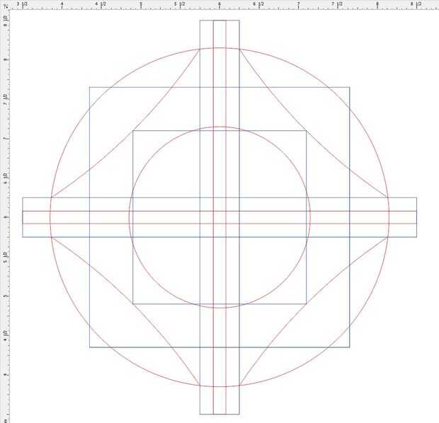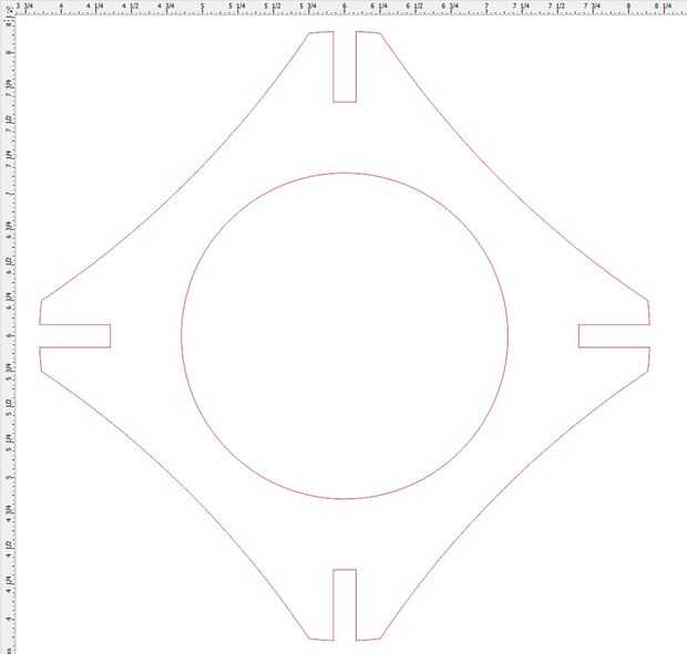 El diseño del anillo de apoyo inferior comienza de manera similar al disco superior, pero con un agujero en el medio a través del cual pasa el cuello de la botella.  Decidí que no quería un anillo completo en la parte inferior por dos razones.  Agrega aerodinámica y se ve un poco gracioso.  Así que he añadido tres rectángulos de referencia que me permiten sacar uniformemente una sección del anillo entre cada conjunto de aletas.  La primicia se crea con la herramienta curva de 3 puntos y los nodos apropiados y cruces en los rectángulos de la referencia.  Finalmente, utilice la herramienta Virtual segmento borrar para deshacerse de todos los segmentos de línea innecesarios.