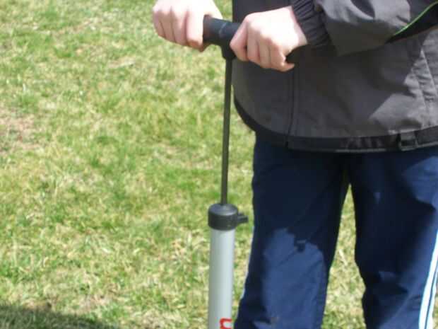 a continuación, ponga el vástago del neumático de la bomba de bicicleta y correr a través del stand de PVC. entonces puso la madre del neumático en la botella. luego voltear la botella en el soporte de PVC. Comience el bombeo. el agua debe empezar a burbujear. Asegúrese de que el agua no es escaparse hacia fuera (si un poco es que está bien). luego seguir bombeando hasta que... DESPEGA!!!