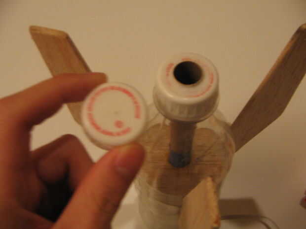 A continuación, tomar la tapa de la botella y perfore un agujero en el medio (segunda foto). Recomiendo el uso de motores de diámetro de 18mm para el mejor desempeño, el cohete que se muestra tiene motores más pequeños de 13mm. Si desea que su cohete a ser un modelo de exposición estática, puede omitir este paso y la llegada pocos después.