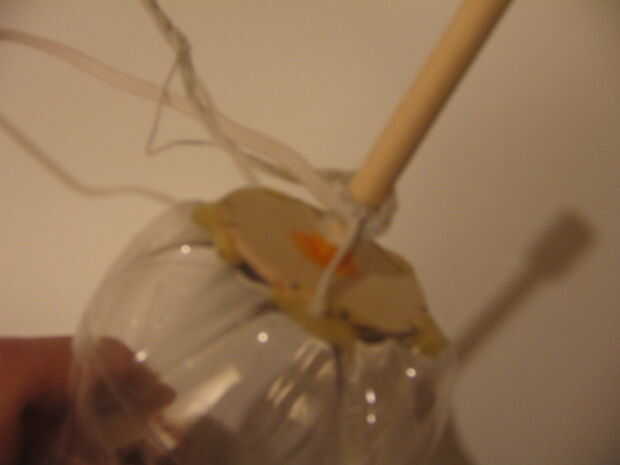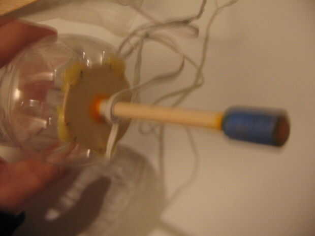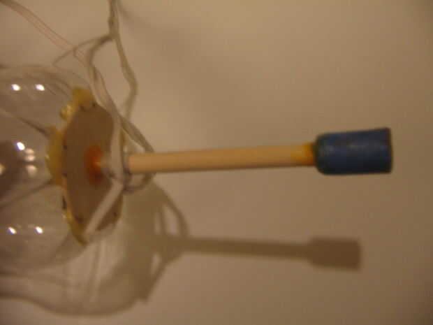¿Recuerda cómo en el paso anterior cortar un círculo de balsa y perforó un agujero en él? Básicamente hacen lo mismo, pero hacer el círculo de la balsa lo suficientemente pequeño como para que usted puede pegarlo en la parte inferior de la botella superior (que es confusas, basta con mirar la imagen).