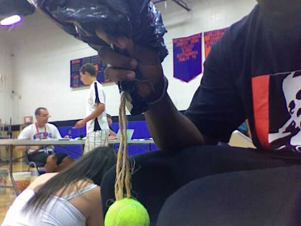 Después de cinta las esquinas toman los cabos sueltos y grifo de corte una ranura en la pelota de tenis para conectar la cadena a crear su paracaídas.