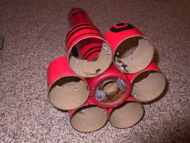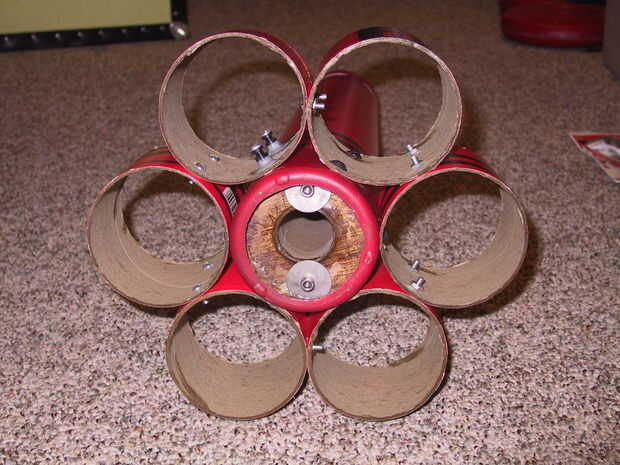 Pares de aletas son atornillados para alinearlos. Cada par se conecta luego al cohete usando tornillos para madera que pasan por el tubo de aleta, a través del tubo del cohete y en la madera anillos de centrado. Se añaden pernos para conectar cada par de tubos a los pares vecinos.
