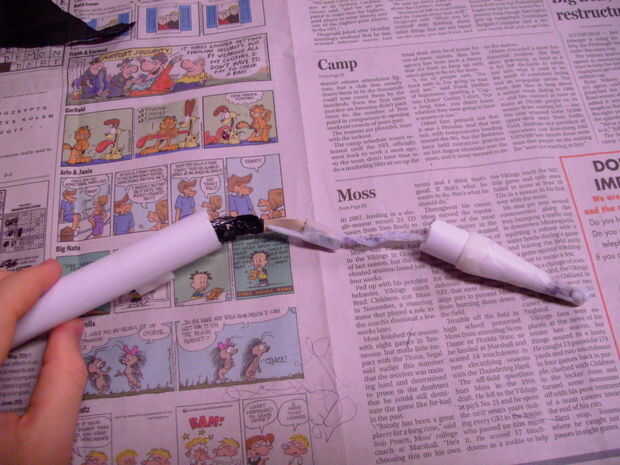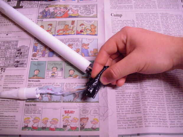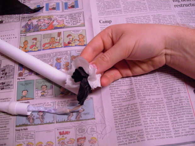 Nota: elegí utilizar banderolas en vez de un paracaídas por dos razones. Uno, el cohete es pequeño y bastante ligero que las banderolas velocidad bastante bien. Dos, yo me estoy limitando a la cadena de la cinta que es demasiado gruesa para este tamaño de tubo de cuerpo. Si están haciendo un cohete más grande o tiene cuerdas más delgadas, no dude en probar y usar un paracaídas.