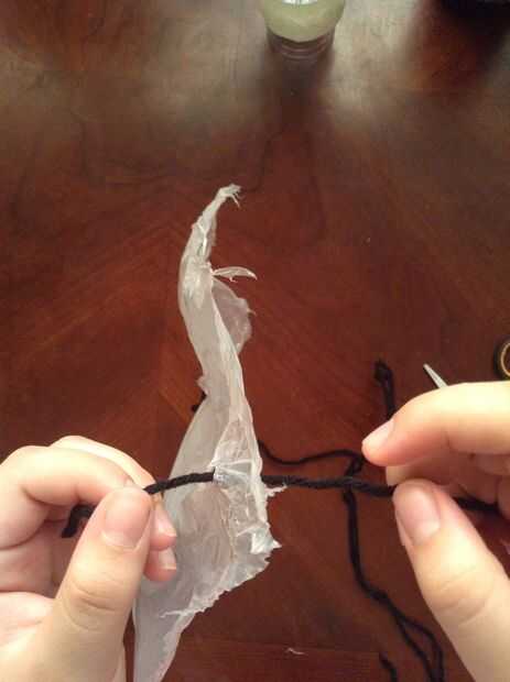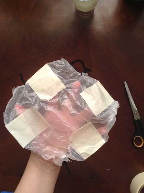 Ahora pock 4 agujeros en los lados de lo paracaídas para las piezas de anhelan ir. Cuando las piezas van en atarlos a lo paracaídas para que se caigan. Luego ate un nudo grande en el extremo como en la imagen. Siempre puede utilizar alguna cinta para las partes accidentalmente apagado, que es lo que hice. Pero asegúrese de que el paracaídas no es muy pesado por lo que podría funcionar.