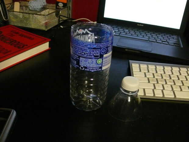 esta parte es simple. todo lo que tienes que hacer es cortar la parte superior de una botella de agua justo encima de la etiqueta. cosas la parte que solo corte en el cilindro (Foto 2) luego corte un orificio en la parte inferior del cilindro sólo lo suficientemente grande como para que lo del tubo de aire en. (Foto 3)