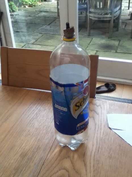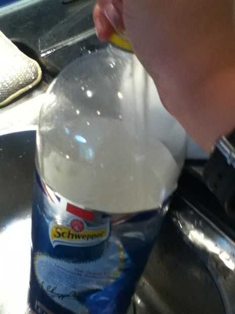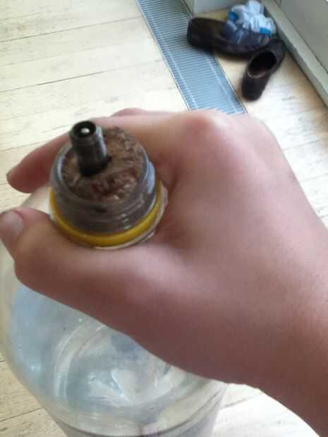 Llene la botella de limonada que es aproximadamente 1/3 palo completo luego en el corcho con la válvula en el mismo. Si el corcho no entra, use un cuchillo para segarla.