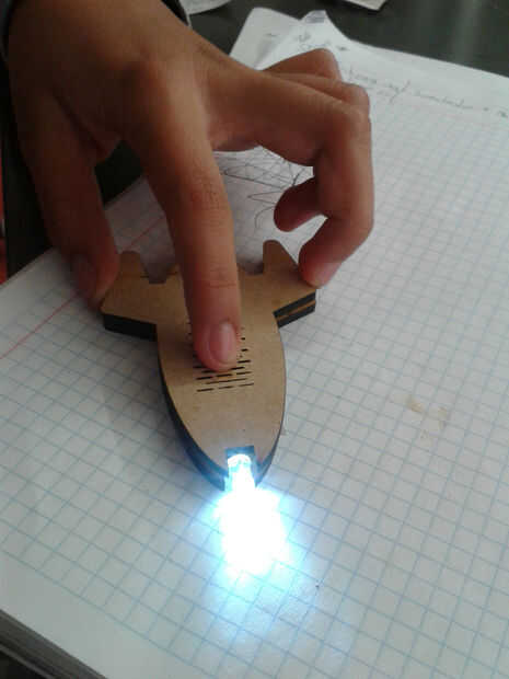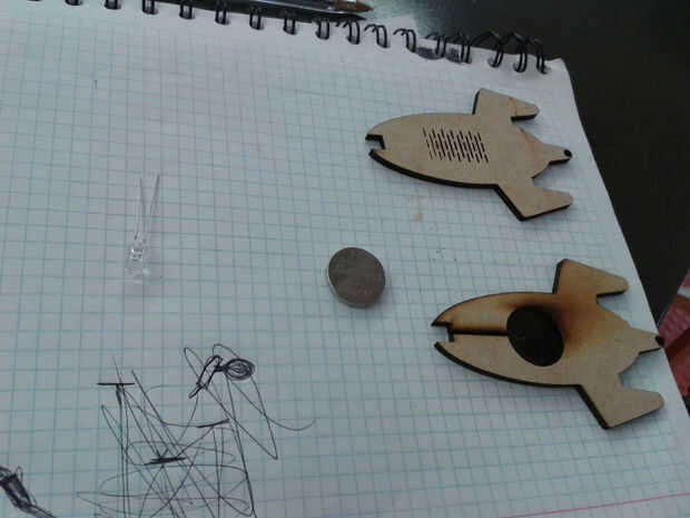 * 2 Figuras de cohete, pueden ser de madera de MDF de 3mm de preferncia (cortado con la cortadora láser, debe tener un orificio para la argolla de metal, ademas del espacio por dentro para montaje la bateria y por último dejar un pequeño espacio entre los pedazos cortados para el LED), (un lado de la figura debe de tener alguna seña particular para nominales donde corresponde)