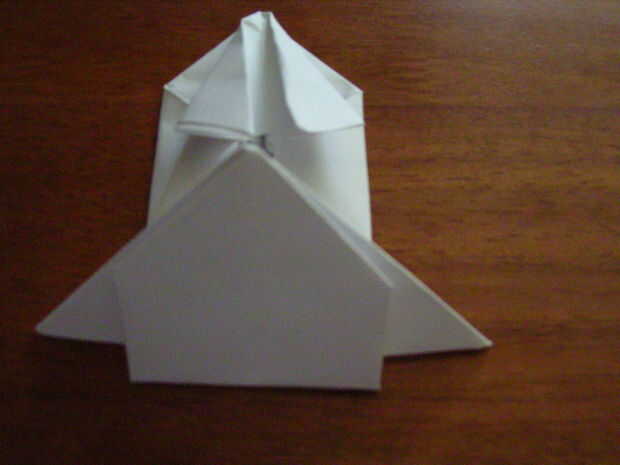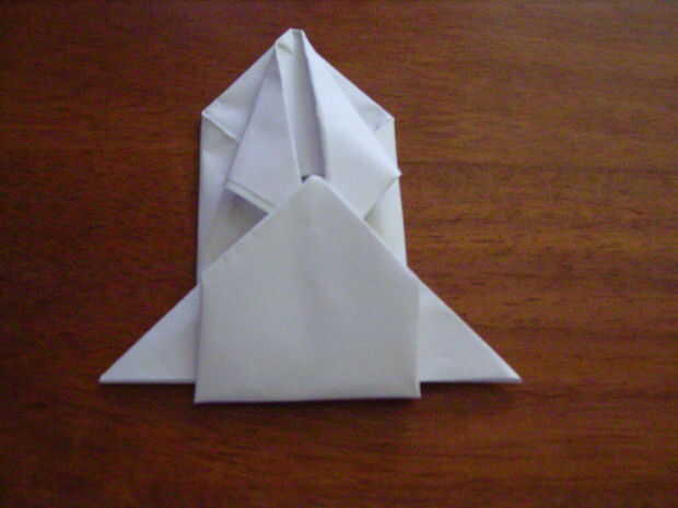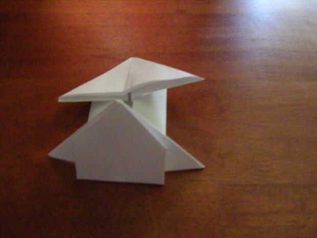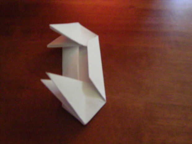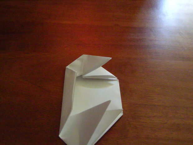 1 ahora pliega el bottem. Desplegar 2 allí es 2 partes en el lado (no los triángulos) doblan. 3 el triángulo superior, doblar las aletas hacia abajo. 4 las aletas tuck en el triángulo de bottem (que debe estar doblado).