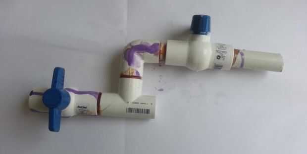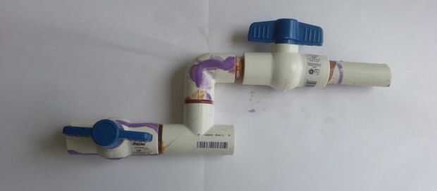 - Pegue la otra válvula de bola para la 1 sección de ½" en la articulación del codo. Asegúrese de que la perilla de la manija de la válvula es opuesto del resto de la Asamblea.