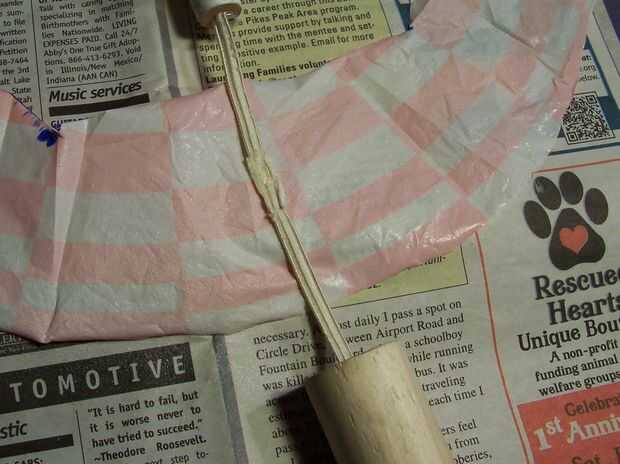 Cubra cuidadosamente la superficie interior de la serpentina con adhesivo en aerosol (3 M Super 77). Luego doblar rápidamente el streamer sobre y en sí mismo vinculante firmemente a la cuerda del choque. Recortar el streamer a su forma y tamaño final.