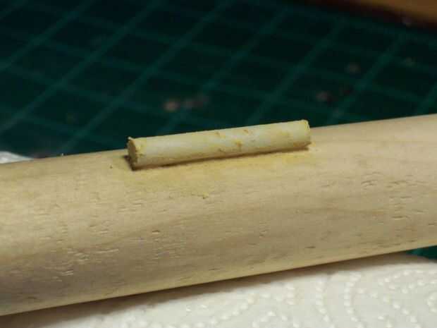 Punto del cuerpo para localizar la patilla el equilibrio longitudinal encontró equilibrio sobre un dedo. El estirón fue unido con pegamento para madera y la junta fue sellada con madera plástica acetona diluido (Figura 26). Madera plástica fue pintado sobre la zapata para mejorar su stainability.
