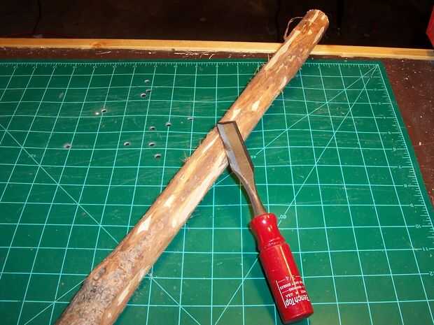 Seleccione una pieza que es alrededor de dos pulgadas de diámetro y recto durante al menos un pie. Use un cincel o lo que funciona para quitar la corteza de la sección de la rama que desea utilizar (Figura 2).