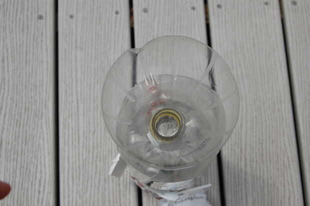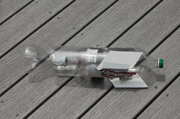 Para hacer el centro, tienes que cortar la otra botella de 2 litros. Cortar la parte superior por lo que habrá espacio suficiente para que el paracaídas para adaptarse. Luego corte la parte inferior de la botella de dos litros para que se queden con un pedazo de mediano. Tome la parte superior de la botella superior redondeada que ya han cortado y la cinta hasta el final de la botella de motor. Luego tape la parte superior recién cortada para que la parte superior, grabarlos dos en la apertura. Deslice la pieza central sobre la parte superior y cinta adhesiva en el extremo de la botella de motor. Debe parecerse a las imágenes.