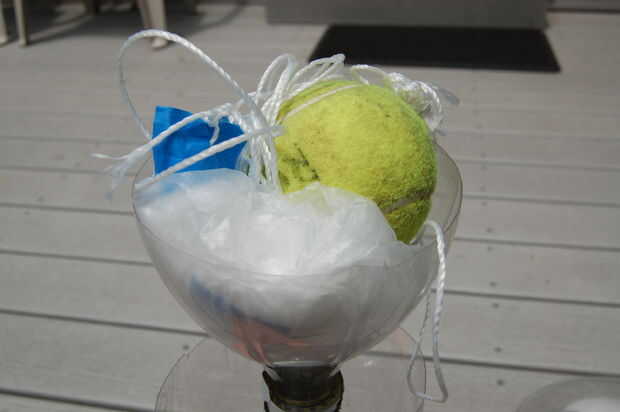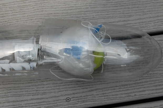 Colocar el paracaídas en la parte superior "Copa" y colocar la pelota de tenis en la parte superior. Poner en la parte superior redondeada para que se sienta en la pieza media. Llenarlo con un poco menos de 1 litro de agua, presionar y lanzar! La pelota de tenis debe flotar suavemente hacia el suelo.
