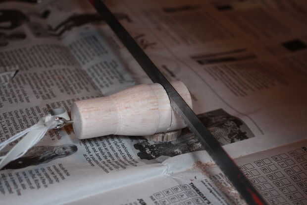 Utilizando la línea de guía para mantener su nivel de corte, continúe a la sierra a través de la madera. Gire la base alrededor para cortar alrededor de la primera exterior y mantenga sus ojos en la línea de guía para mantener tu línea recta. Continuar cortando uniformemente todo alrededor hacia el centro. Cuando estén casi hechas, corte a través del centro.