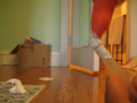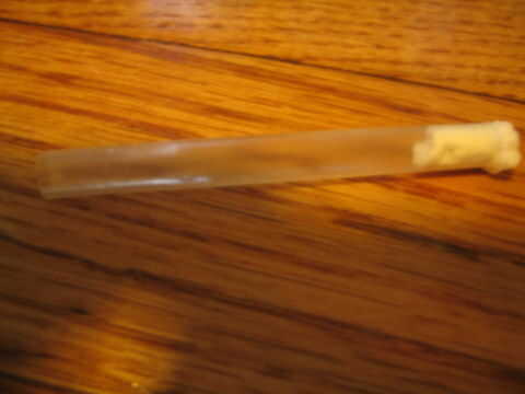 Tome un pedazo de tejido (Foto 1) y coloque una pequeña bola (cuadro 2). Ahora inserte el tejido de la paja (imagen 3). Tomar algun pegamento (pegamento caliente o pegamento de Elmer) y poner un pequeño rincón en la parte superior del tejido (Figura 4). Ahora pega la paja en el barril (cuadro 5).