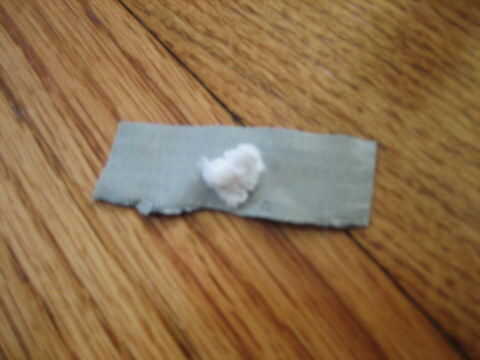 Tomar otra pieza de tejido y coloque. poner en un trozo de cinta, como se muestra en el cuadro 1. Luego poner esto en la parte superior del cañón (cuadro 2). Puede sellar con poco más de cinta. Cuadro 3 muestra el cohete hasta el momento.