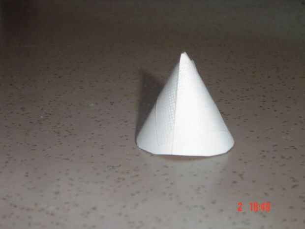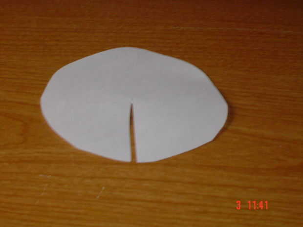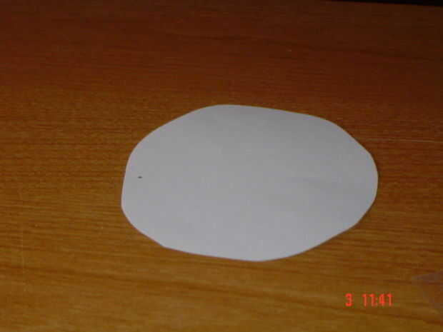 Ahora corte un círculo de unos 8 cm de diámetro en su papel, realizar un corte radial en el centro del círculo. tomar un borde y deslícelo sobre el otro borde, mantenga deslizante y comienza a formar un cono, esto no esta hasta la base del cono es del mismo tamaño que la parte superior de la lata de película. Cinta el cono todo y esto será la nariz de los cohetes.