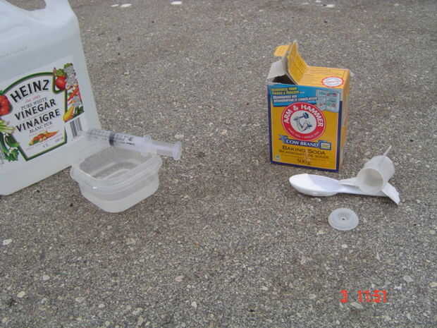 Ahora tome la jeringa y llénela con 5ml - 8ml de vinagre y meter la punta de la jeringa en el agujero de la tapa, no te preocupes la reacción no se iniciará hasta que el émbolo se empuja.