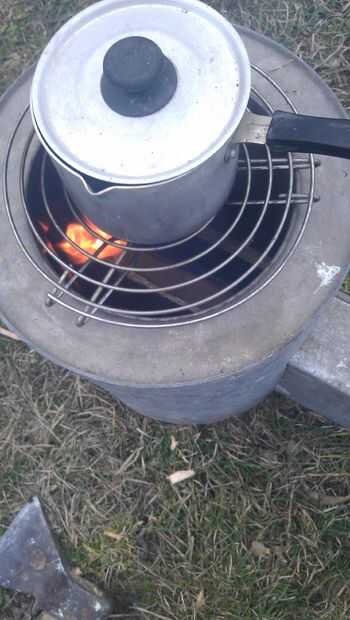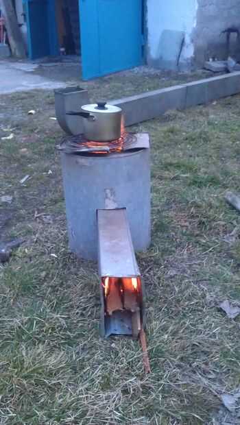 Estufa cohete ha sido probado con éxito. Agua comenzó a hervir durante 5 minutos. Estufa funcione necesita leña un poco. Encendida mucho tiempo, da mucho calor. La estufa fue hecha para un solo uso, de material de desecho. Le trabajó, y tiré. Aunque es muy eficiente. Para la fabricación de estufas utiliza herramientas: 1) la lijadora angular 2) hacha 3) Pin. Gracias a todos. :)
