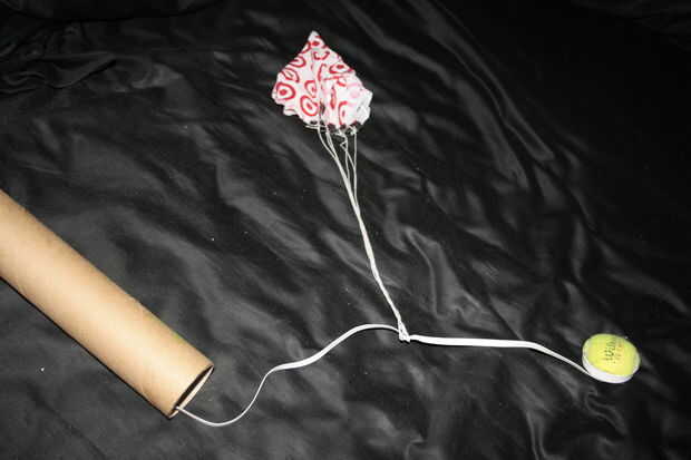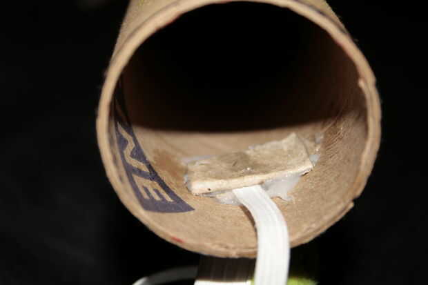 Tomar el paracaídas y lugar mediados maneras sobre el elástico. Me coloca el paracaídas a través de su extremo inferior y luego ató un nudo en el elástico para que el paracaídas no se mueve. Tome el tubo grande y colocar una cantidad generosa de pegamento sobre una o dos pulgadas dentro del tubo y luego tome el extremo del elástico que tiene solo la cartulina atados y coloque en el pegamento.