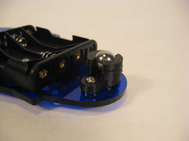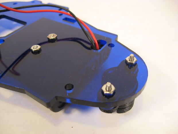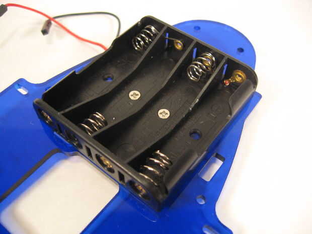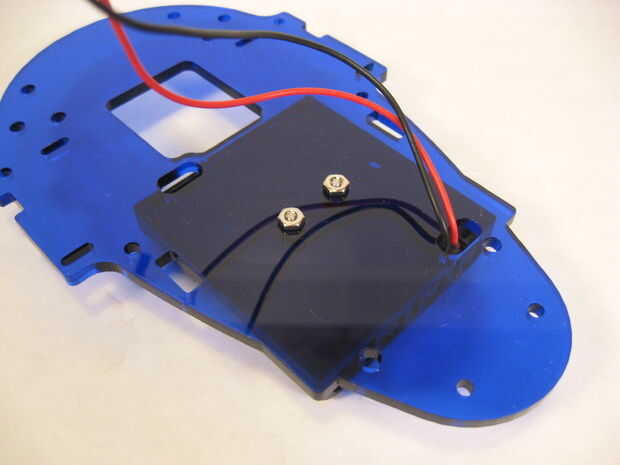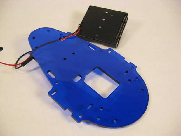 Nota: Si usted está construyendo la versión de robot de arranque de este chasis, simplemente gire la batería 180 grados. Los cables se pasan por el "otro" batería agujero, más cercano al orificio más grande de centro. Se utilizarán los mismos agujeros y tornillos para montaje.
