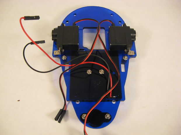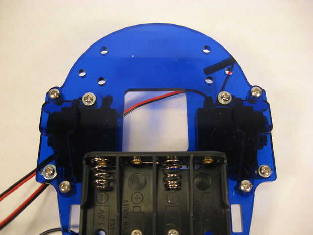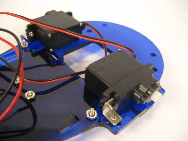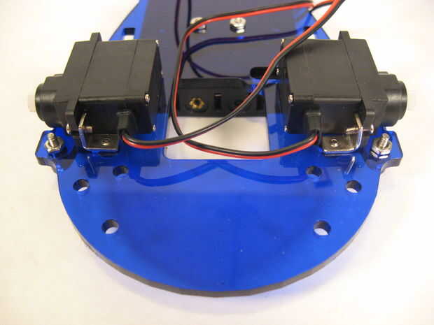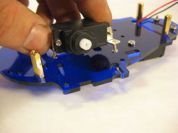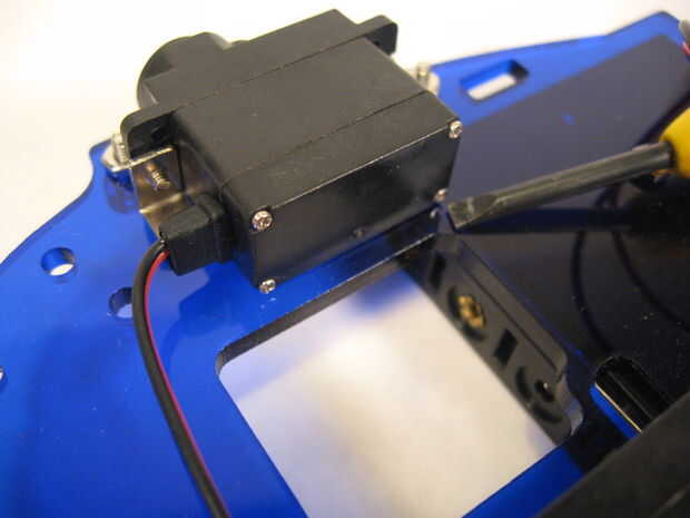 Intenta conseguir los tornillos poco centrados en las ranuras y apriete hacia abajo. Más adelante puede que les Afloje un poco por lo que puede fudge los motores directamente. La mejor manera de hacerlo es "globo ocular" en el borde inferior del servo contra el agujero de centro grande del chasis. Estos dos bordes deben ser paralelos. --En una de las fotos, estoy apuntando a esta área con un destornillador pequeño.