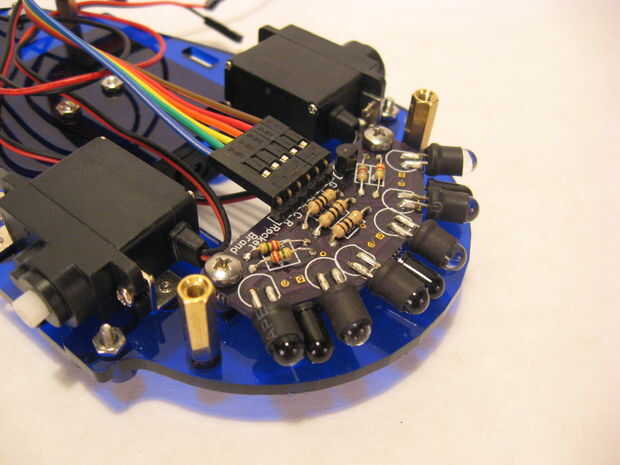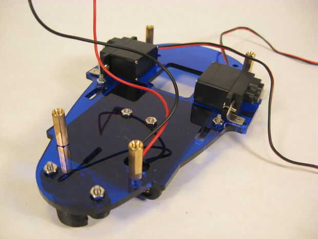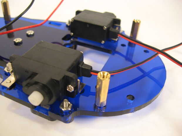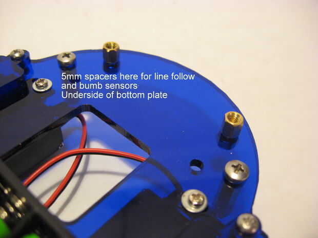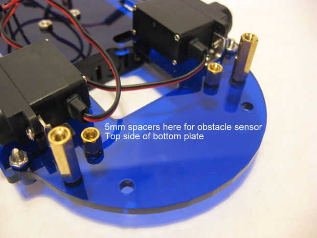 Además, ahora es el momento de instalar los separadores de donde más tarde montaremos nuestros sensores. Este hardware se incluye con el sensor y consta de (2) separadores de 5mm y hardware relacionado. Tome nota si usted está usando el detector de obstáculos o línea seguir sensor, revisa las fotos de arriba y palo-em en. Si está usando el detector de obstáculos, (y sus cables) pueden instalar ahora. Caramba, usted podría instalar sus interruptores de golpe ahora si tenes em. Una vez más, ver fotos.