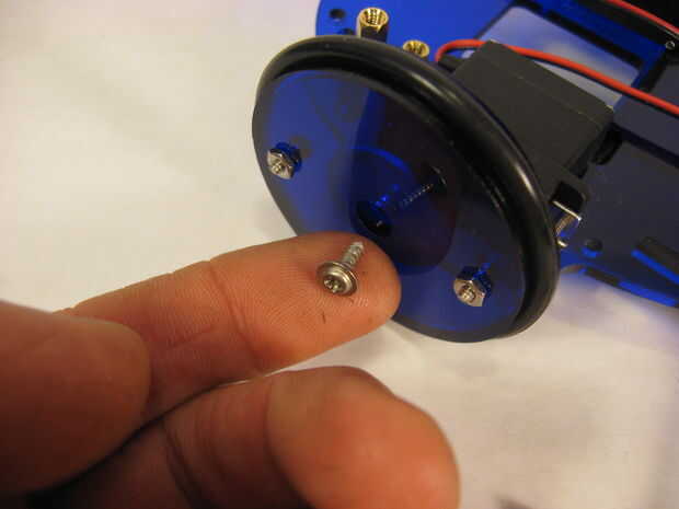 Ahora puede deslizarse en las juntas tóricas (2) en las ruedas. También puede meter las ruedas en su robot. Seguir adelante e instale el tornillo de centro también. Ser muy suave con este tornillo, sólo necesita ajuste.