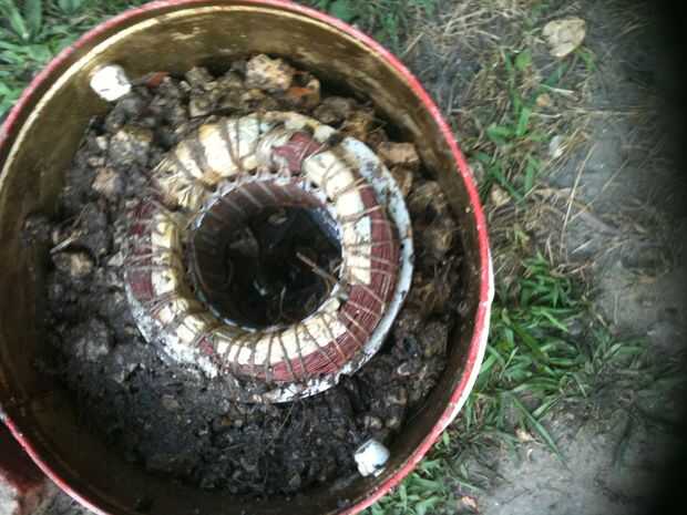 -La chimenea de un viejo carrete cortadora de césped y residuos de hierro