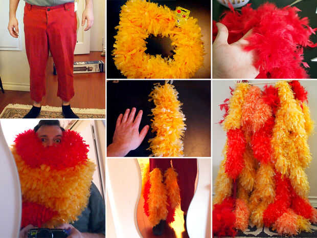 Hice las llamas del escape de collares de plástico fiesta con volantes, he encontrado estos collares en rosa, rojo, amarillo y luz - perfecto para las llamas. También encontré una boa de plumas roja que he añadido en alguna textura diferentes. Los collares fueron cortados en tiras de 1' y un extremo fue cosido en los pantalones. A partir de la parte inferior y subiendo los pantalones, la longitud del collar fueron escalonada y superpuesta para crear un penacho de llamas. Debe prestarse atención a la parte inferior de los pantalones, donde las llamas cubren los pies.