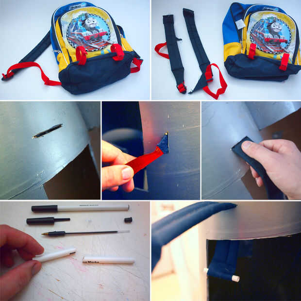 Las ubicaciones aproximadas de la correa aproximadamente fueron marcadas en el cuerpo del cohete. Luego, pequeñas rendijas horizontales fueron sobre el torso de apertura en el cohete de la misma anchura y espesor de la correa de la mochila, y el extremo superior de la correa de la mochila pasó a través de la luz. Para asegurar la correa de la había herida el extremo alrededor del tubo de un bolígrafo de oficina barato, luego coser la correa alrededor de la tubería. Puesto que el tubo es más grande que la abertura de la raja la correa no pasa a través y se asegura.