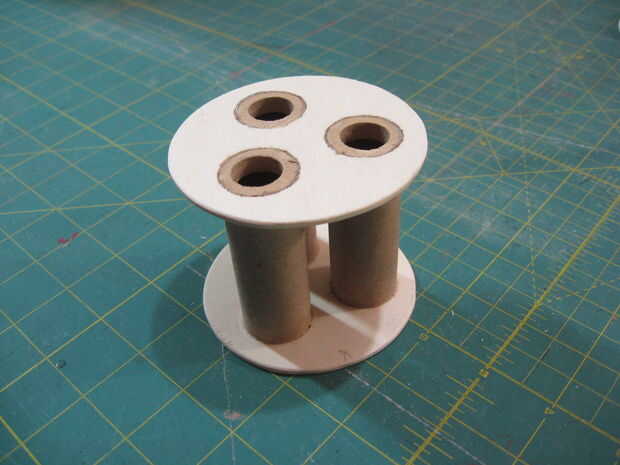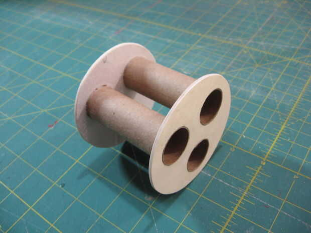 Los tubos de la carcasa del motor fueron hechos usando el mismo método descrito en el instructivo mencionado en el paso anterior. Los anillos del bloque del motor se muestra en la primera foto se hicieron de MDF de 1/4". Los dos círculos que sostienen los tres tubos motor fueron cortados de 1/8" arte madera contrachapada.