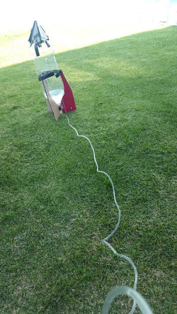 Ahora que todos los componentes están en su lugar, llega el momento de lanzamiento. Coloque el cohete tal como se muestra en la imagen. No olvide añadir algunos agua (2/5 de la capacidad de la botella) y coloque el corcho del vino en la botella. Empezar a aumentar la presión de aire dentro de la botella con la bomba de aire. En cierto punto la presión dentro de la botella es bastante grande y el agua va a propulsar el cohete.