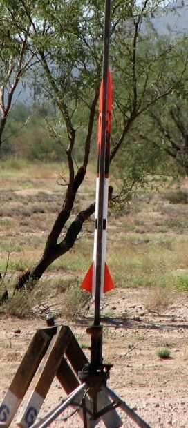 El cohete voló sin problemas; la única sorpresa fue que el vehículo iba mucho más alto que el predicho. He trabajado el problema hacia atrás y determinar el coeficiente de arrastre que.47, manera inferior a los 75 que supone el software. Dio unas palmaditas yo mismo en la parte posterior: eso significaba que había hecho un buen trabajo en la construcción y acabado. Un motor H llevó a 3500 pies, y con un motor, fue a 5600 pies! ¡ Wow!