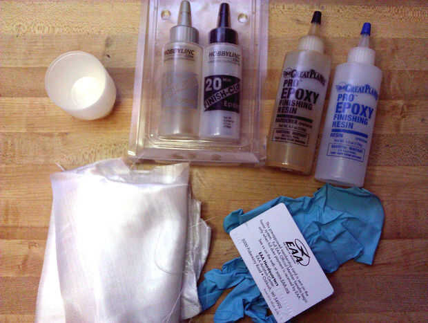 No utilizo el epoxi West System que mayoría de la gente recomienda ya que no necesita mucho. En su lugar usé "Final-cura," disponible en la mayoría de las tiendas de RC de la manía, también conocida como resina de acabado. Tiene acerca de un tiempo de trabajo de 20 minutos, que es suficiente si usted mezcla pequeñas cantidades de 1/2 onza a la vez.