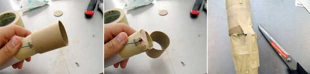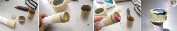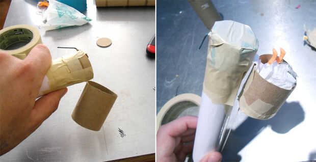 Con los fuegos artificiales instalados, otro círculo de cartulina fue cubierto en papel de aluminio e instalado sobre la abertura del cilindro. Más cinta adhesiva fue utilizada para asegurar la carga en el lugar, asegurando que no estaban cubiertas las aberturas con muescas creadas anteriormente.