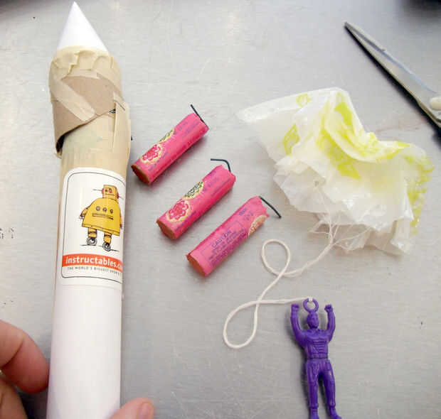Otro cilindro de cartulina ya hizo y unido al inferior en una sola área pequeña con cinta de enmascarar, por lo que el cilindro superior una bisagra. Esta bisagra permite la carga útil abrir cuando se encienden y se desplegará el soldado valiente paracaídas. Bueno, esa era la idea. La parte superior de la Asamblea superior se tapa con otro círculo de cartulina, luego un soldado paracaídas fue insertado en la Asamblea. Cierre el conjunto superior y utilizar una sola tira de cinta adhesiva sobre la muesca hecha antes del punto de explosión de fuegos artificiales.