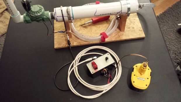 El "botón" de conexión a la válvula con la batería. Activación del sistema. Carga de un cohete. (Dejé el tubo enrollado).