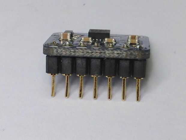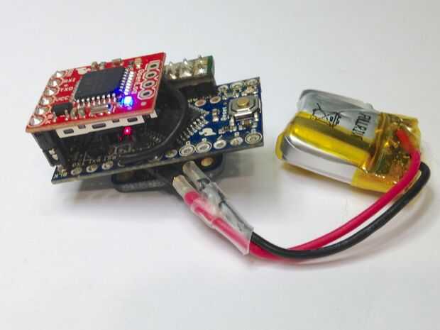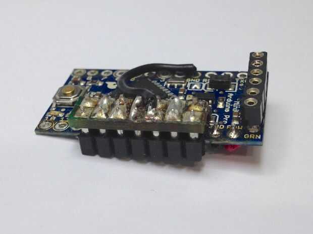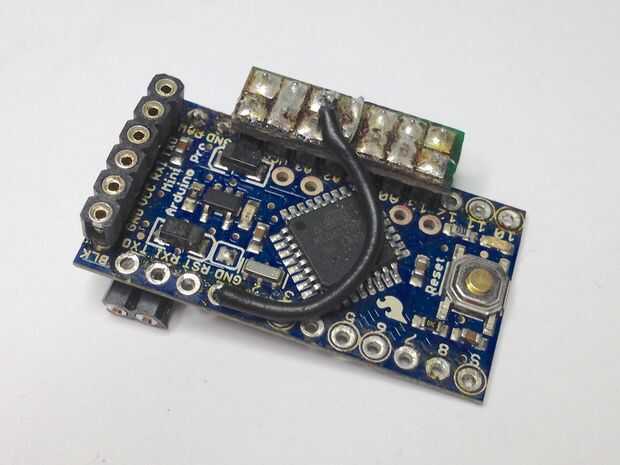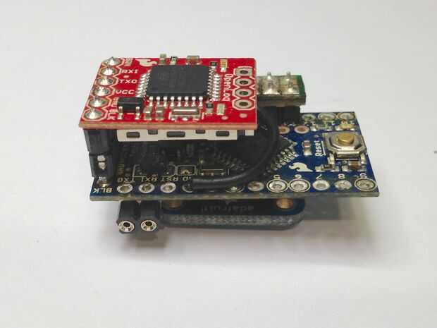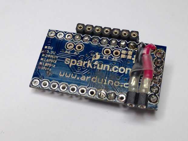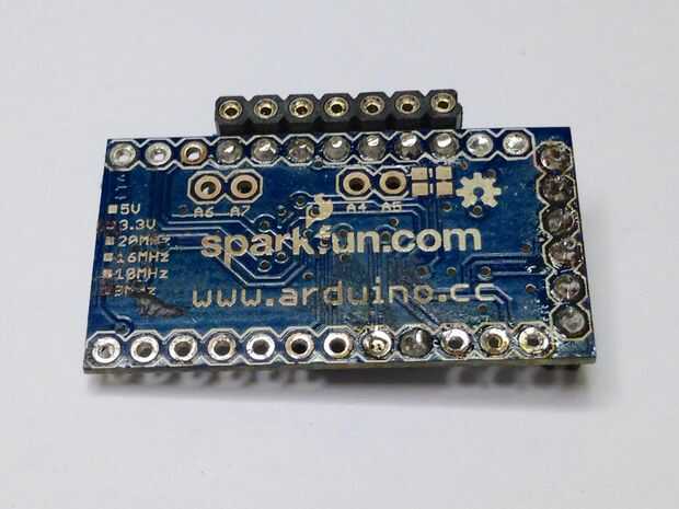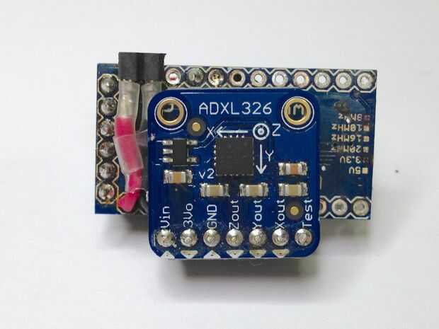 Para mantener el circuito como pequeño y peso ligero como sea posible el OpenLog y acelerómetro fueron conectados directamente con el Mini Pro con pines y una pequeña sección de dos filas de tabla de prototipos. Tomamos la cabecera siete pin macho que viene con la Junta de acelerómetro y soldar la placa de prototipos directamente a los pines de entrada analógicos en el Mini Pro. Comenzamos con el pin 13 y soldar todos los siete pines. A continuación hemos soldado un jefe del pin siete pin hembra máquina en la siguiente fila de agujeros en la placa de prototipos. El jefe del perno máquina femenina está orientado para que la Junta del acelerómetro se encuentra por debajo de la Mini Pro.