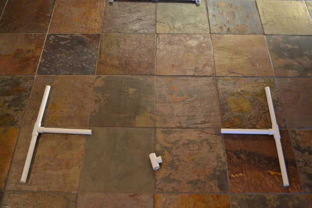 1. Aplicar cemento de PVC a una abertura de un conector T y luego a un extremo de un 9" pedazo de tubo. Presione las dos piezas pegadas junto con un movimiento rápido. Asegúrese de que la tubería esté completamente asentada en el conector T golpeando con el mazo.