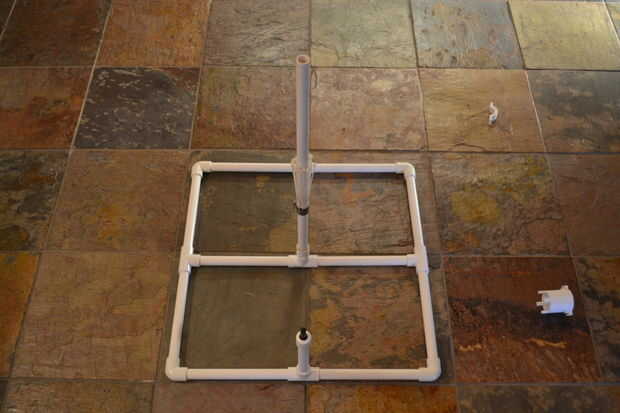 5. Pegar el conjunto de la toma de aire en el conector T (que tiene el puerto de soldadura disolvente) en el borde exterior de la base. Esta pipa extra crea una cámara de aire en el lanzador, que le ayudará a mantener el agua alejada de la válvula como se filtra de vez en cuando en la base del lanzador.