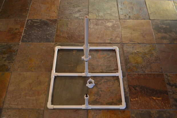 - Inserte la cuña de leña entre las abrazaderas del tapón y el tubo de retención para que el tubo se mantiene hacia arriba contra la botella. Si es necesario, ajuste la posición de las abrazaderas tapón por lo que hay un total de acerca de 1/16" juego de 3 piezas.