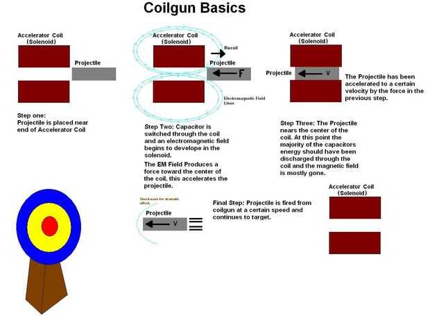 Un diagrama de funcionamiento coilgun básica se incluye en la parte inferior.
