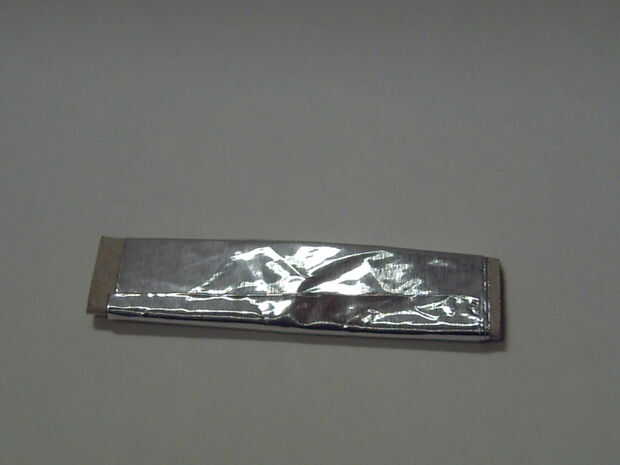 Empezar haciendo la caja de cerillas, cinta aislante de aluminio y tijeras. Presione la caja (sin relleno) plana. Luego, corte el delantero. También, al cortar, si se corta a través de ambas capas, usted conseguirá un pedazo de cartón que tiene un delantero, doblez/pliegue y una pieza igual que es del mismo tamaño que el botón delantero. Pliegue bien y tape con el conducto de cinta (ver figura 4). Suavemente inserte un destornillador en el bolsillo para abrir hacia arriba (Figura 5).