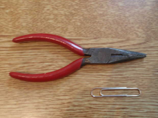 Lleva un clip y levantar un extremo del alambre y doblar lo suficiente como para que pueda obtener sus alicates para agarrarlo. Luego con sus pinzas sólo continuar desenrollar hasta su más o menos recta. Solo prueba e incluso a algunos más hasta que se ve como el mío hace. Como he dicho antes, no necesita absolutamente los alicates pero cuando el clip de la noche hacia fuera en el extremo su difícil sin ellos. Poner el clip de papel a un lado por ahora, pero usted puede deshacerse de los alicates.