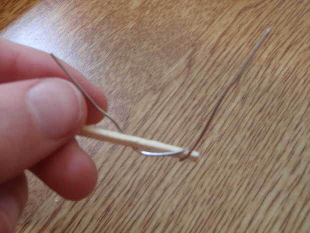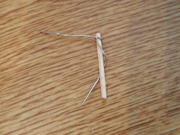 Este paso es un poco más difícil que los demás. Primero tendrá que sujete el clip de papel horizontal y en el frente, de la parte superior del palo de fósforo que usted debe mantener vertical. Con cerca de 1,5 pulgadas del papel-clip sobresale a la izquierda debe doblar el extremo que sobresale a la derecha 1 vez en la parte superior del palo de fósforo y luego dóblelo hacia abajo la palanca pero hacer otro bucle al mismo tiempo (ver imagen). Termina con un extremo asomando en la parte superior y la otra apuntando diagonalmente hacia abajo en el mismo lado.